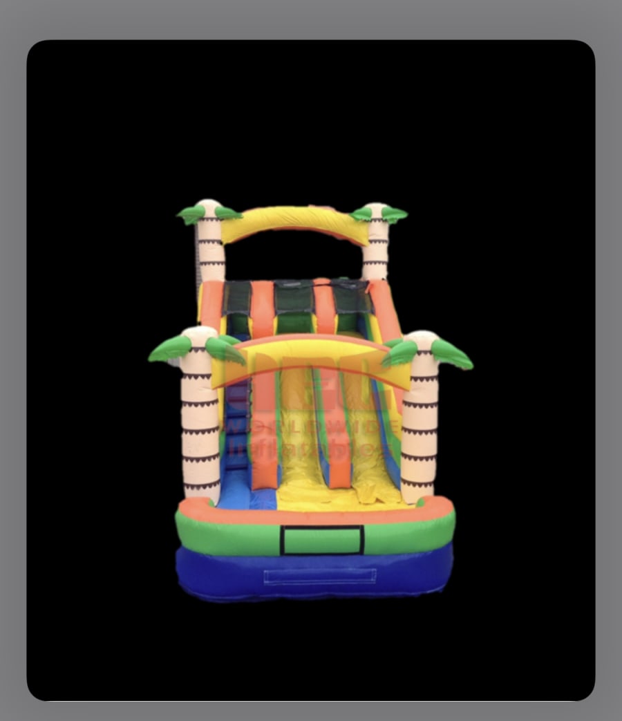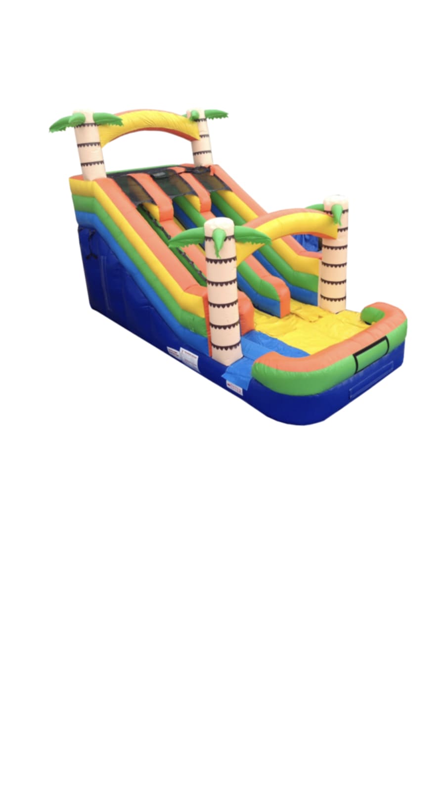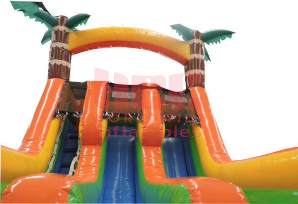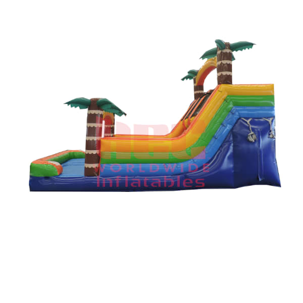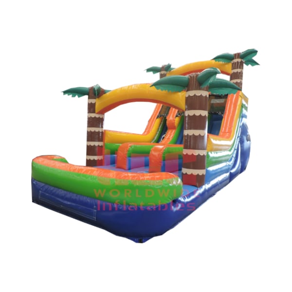 Slide into summer and add a tropical scene to any outdoor party or event with this Tropical Water Slide. With an really attractive green and yellow color scheme and two palm trees decorating the top and the slide exit, this piece is sure to stand out among the crowd. Participants enter the Tropical Water Slide from the left and the climb leads to an 15 foot tall slide that ends with a built-in landing mat of water. The Tropical Water Slide has high inflatable slide walls and top anchor points to ensure the safety of all participants young and old.