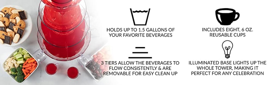 Create a beautifully illuminated centerpiece that works great for any party or event! Holds up to 1. 5-Gallons of beverage and the extension spouts make it easy for guests to serve themselves. The LED lighted base lights up the whole Tower while the cascading Towers flow with your favorite beverage. Includes eight 6-ounce reusable Cups.