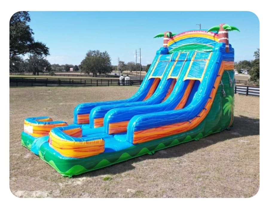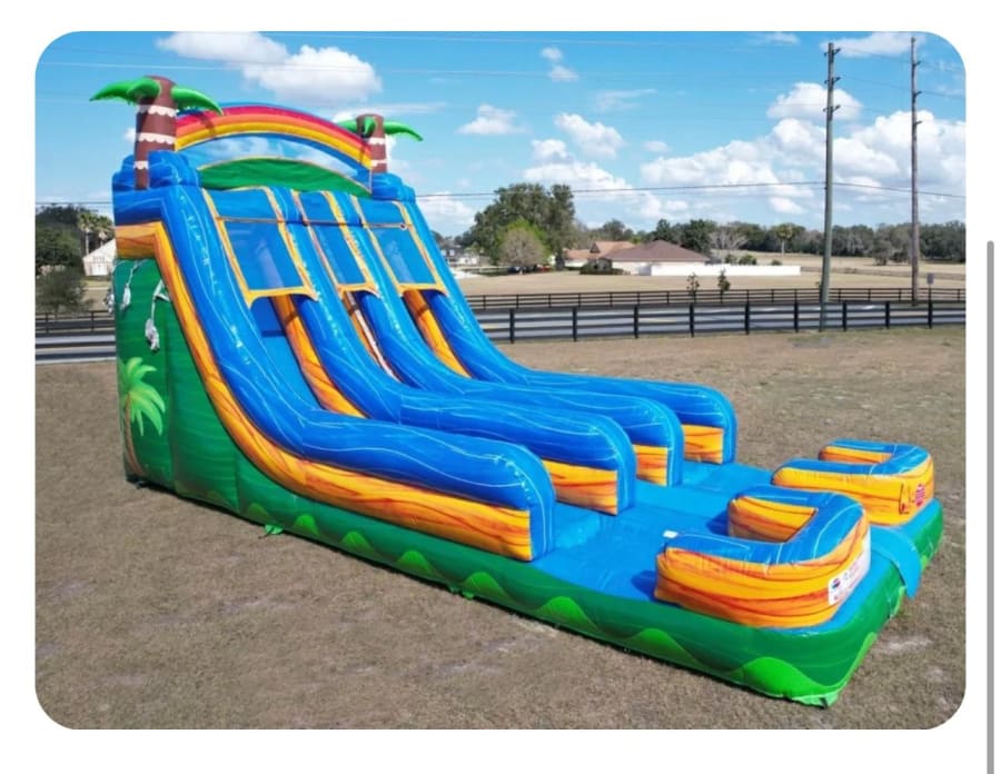 This 18' Double Lane Slide is a definite crowd pleaser. At 18 feet tall with a 16 foot tall slide platform angled at 40 degrees, it is an exciting ride every time through. With two lanes to slide down, the 18' Double Lane Slide is capable of accommodating hundreds of riders each hour. That translates to a ton of fun during any event it is featured at. This ride is also equipped with all the necessary safety features, including: a netted top to ensure proper sliding, tall inflated side walls to safely guide each rider and an inflated bumper stop at the end of the slide. Since children as young as three can safely enjoy this slide, the additional height of the 18' Double Lane Slide makes it suitable for everyone, including adults. With a longer climb up, the 18' Double Lane Slide increases the physical activity, but also doubles the fun. The 18' Double Lane Slide is sure to satisfy all participants.