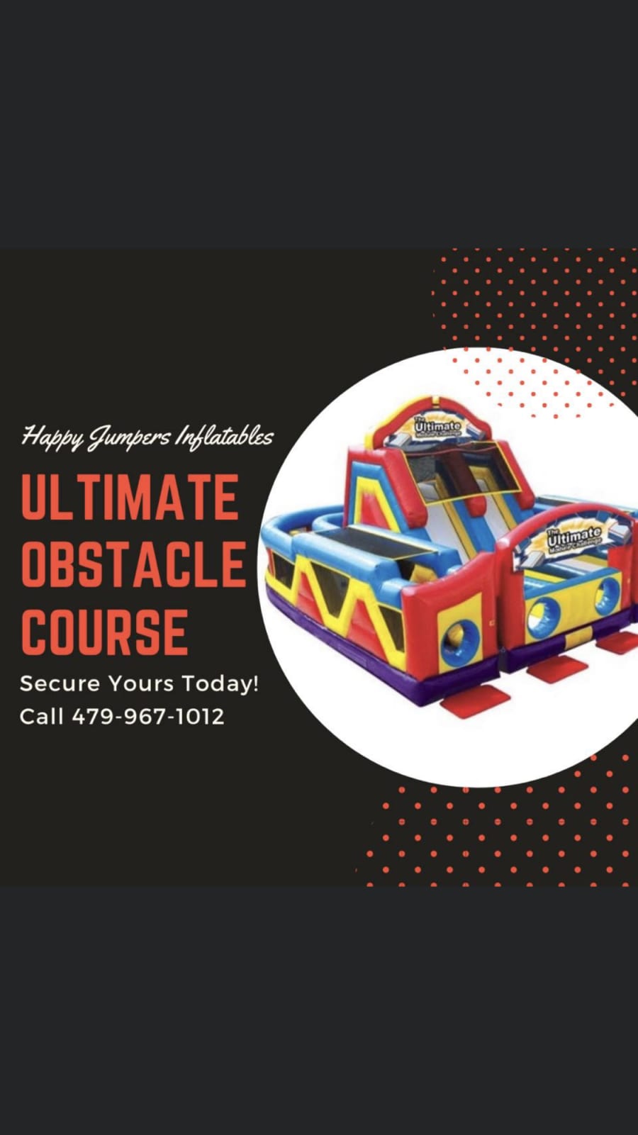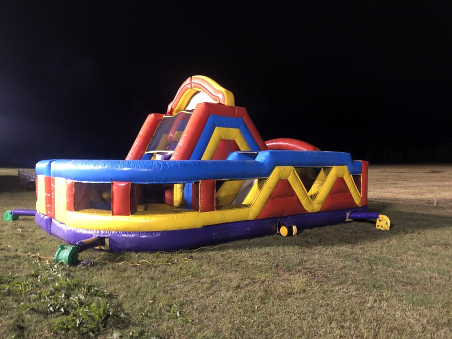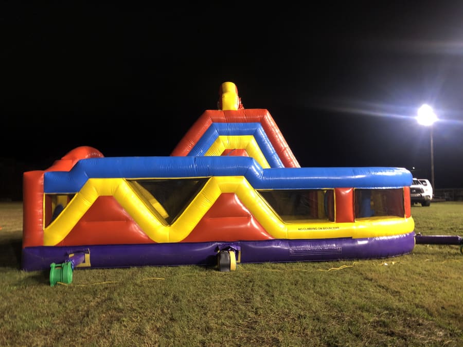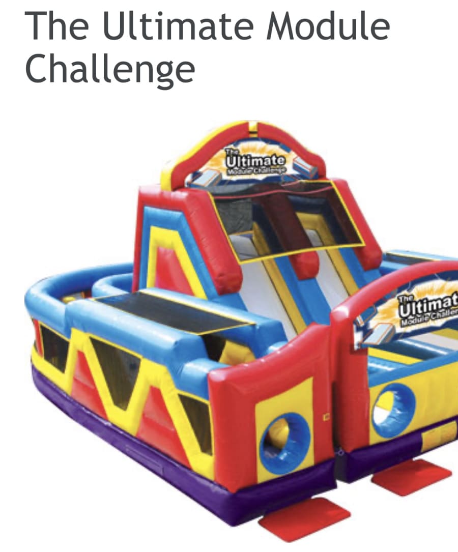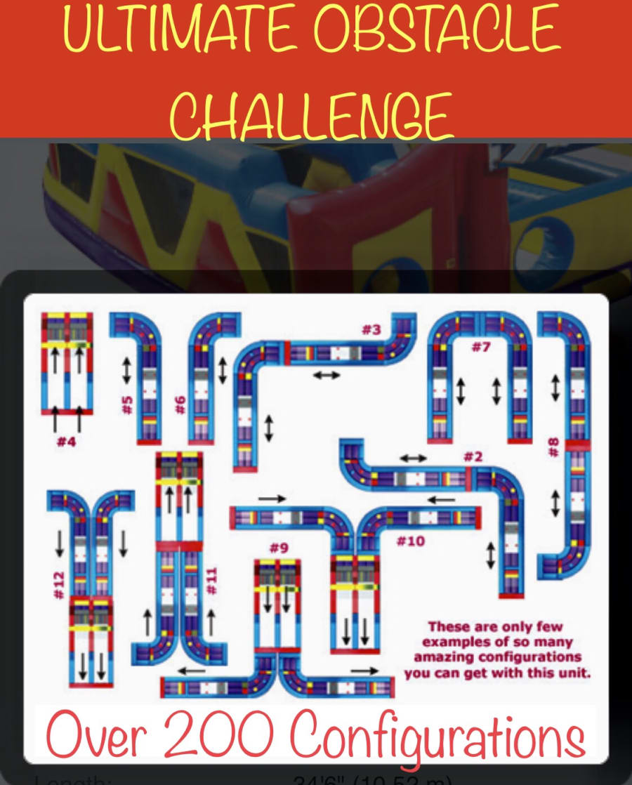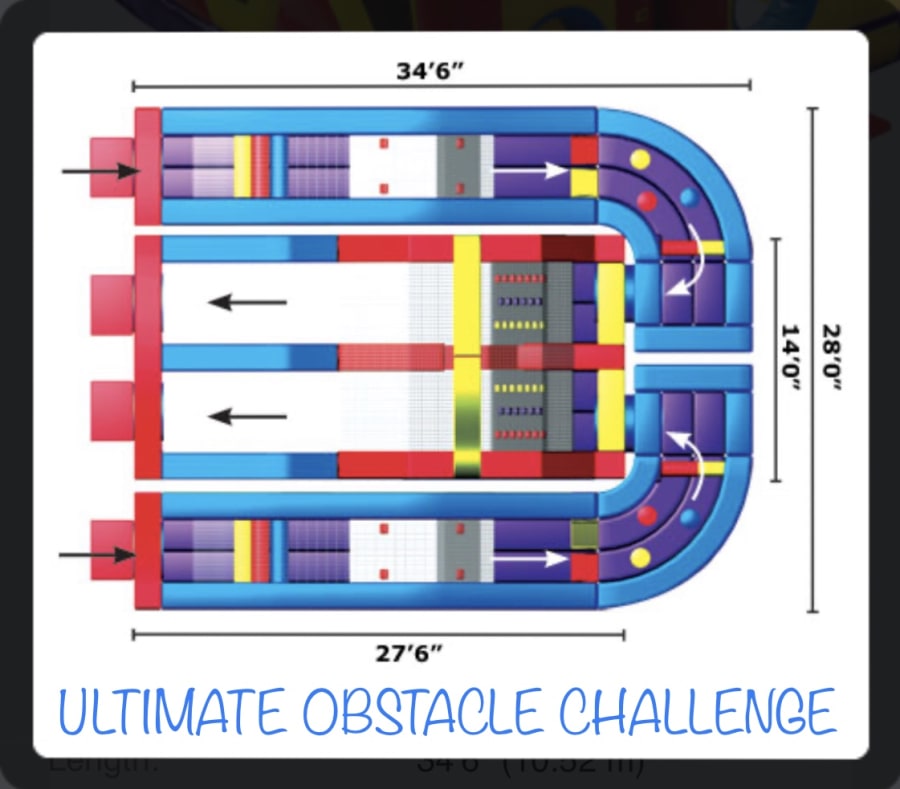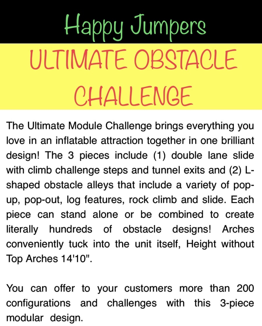 The Ultimate Obstacle Ninja Warrior Challenge brings everything you love in an inflatable attraction together in one brilliant design! The 3 pieces include (1) double lane slide with climb challenge steps and tunnel exits and (2) L-shaped obstacle alleys that include a variety of pop-up, pop-out, log features, rock climb and slide. Each piece can stand alone or be combined to create literally hundreds of obstacle designs! Arches conveniently tuck into the unit itself, Height without Top Arches 14'10". We can offer more than 200 configurations and challenges with this 3-piece modular design.