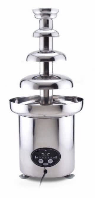 This head turner is a 4-tier fountain with stainless steel base that will impress guests with elegance and style at any special event. This chocolate fountain creates a cascade of sweetness that will add mouth-watering fun to any occasion. Simply pour the recommended amount of melted white or dark chocolate into the base and switch on the motor. Watch as the chocolate is carried to the top of the tower where it flows down each tier in a mesmerizing display. Provide guests with fresh strawberries, marshmallows, pretzels, cookies, and other goodies for dipping. Cheese and barbeque sauces may also be used. Easily disassembles for quick cleanup. The fountain is a beautiful addition to any dining table or casual gatherings with friends and family.