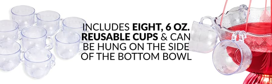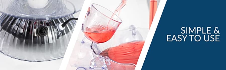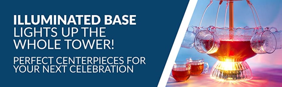 Create a beautifully illuminated centerpiece that works great for any party or event! Holds up to 1. 5-Gallons of beverage and the extension spouts make it easy for guests to serve themselves. The LED lighted base lights up the whole Tower while the cascading Towers flow with your favorite beverage. Includes eight 6-ounce reusable Cups.