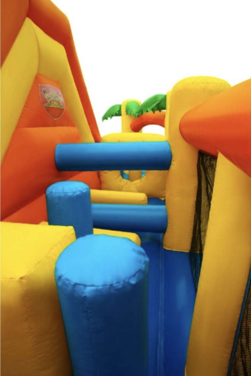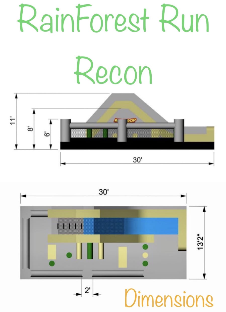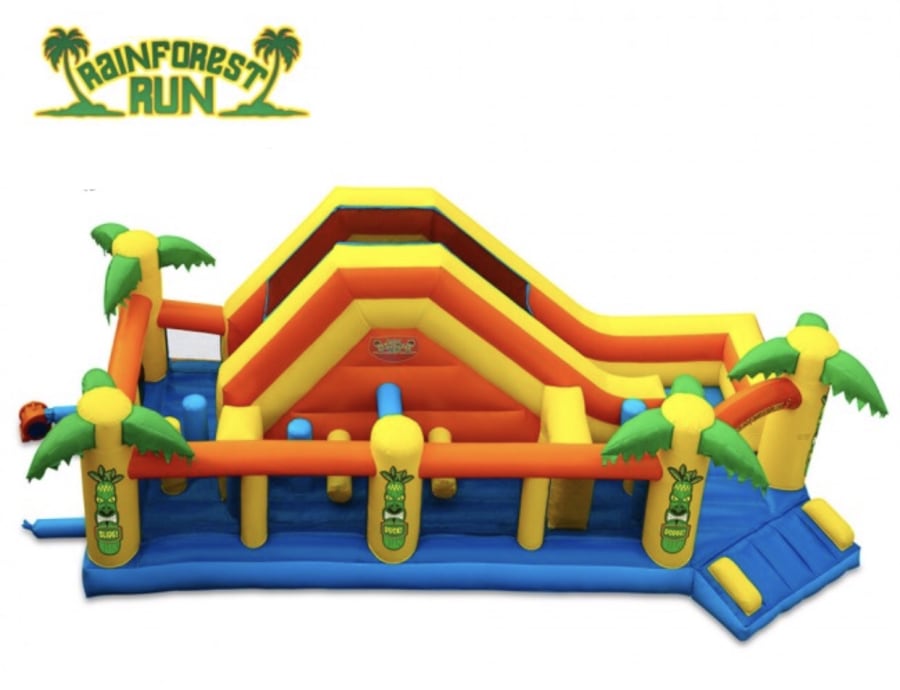 The Rainforest Run obstacle is an endless obstacle slide, in a portable package. The 360 degree design allows players to repeat the obstacle endlessly, but the design is compact enough for the unit to be transported in one piece. At 30 feet long, by 13 feet wide, it takes players through a nearly 90 foot-long loop. Standard linear obstacles typically require 3 consecutive units at triple the cost to achieve this.