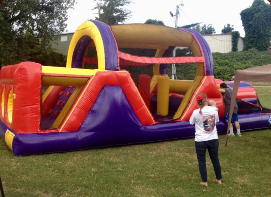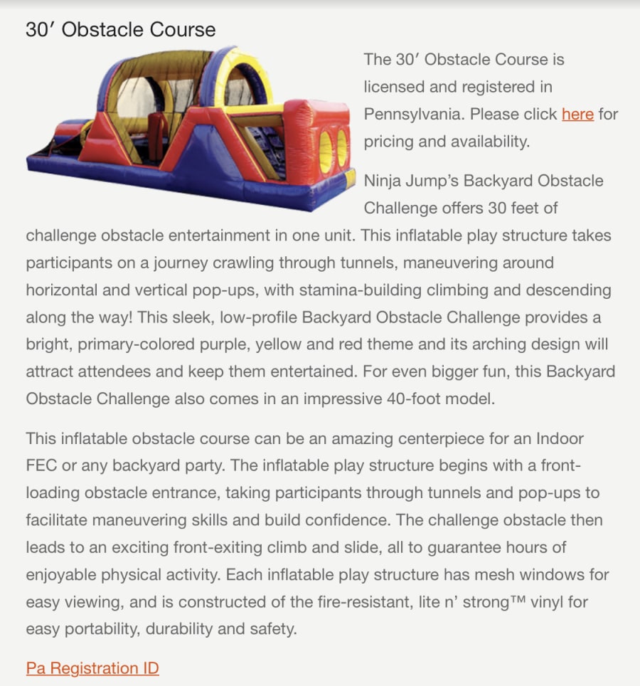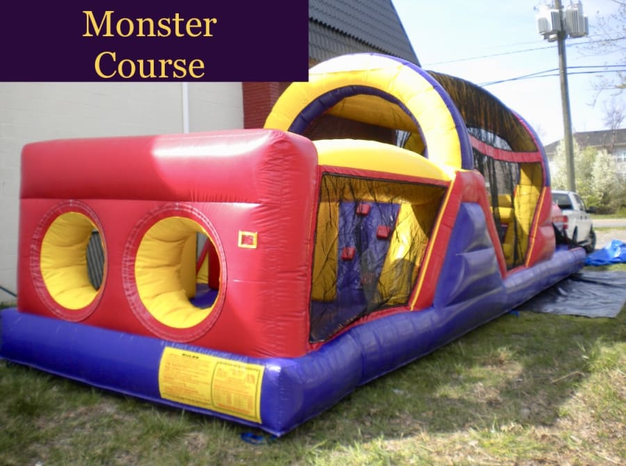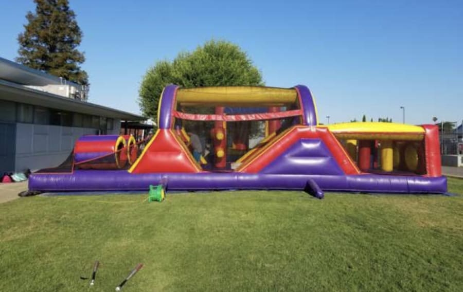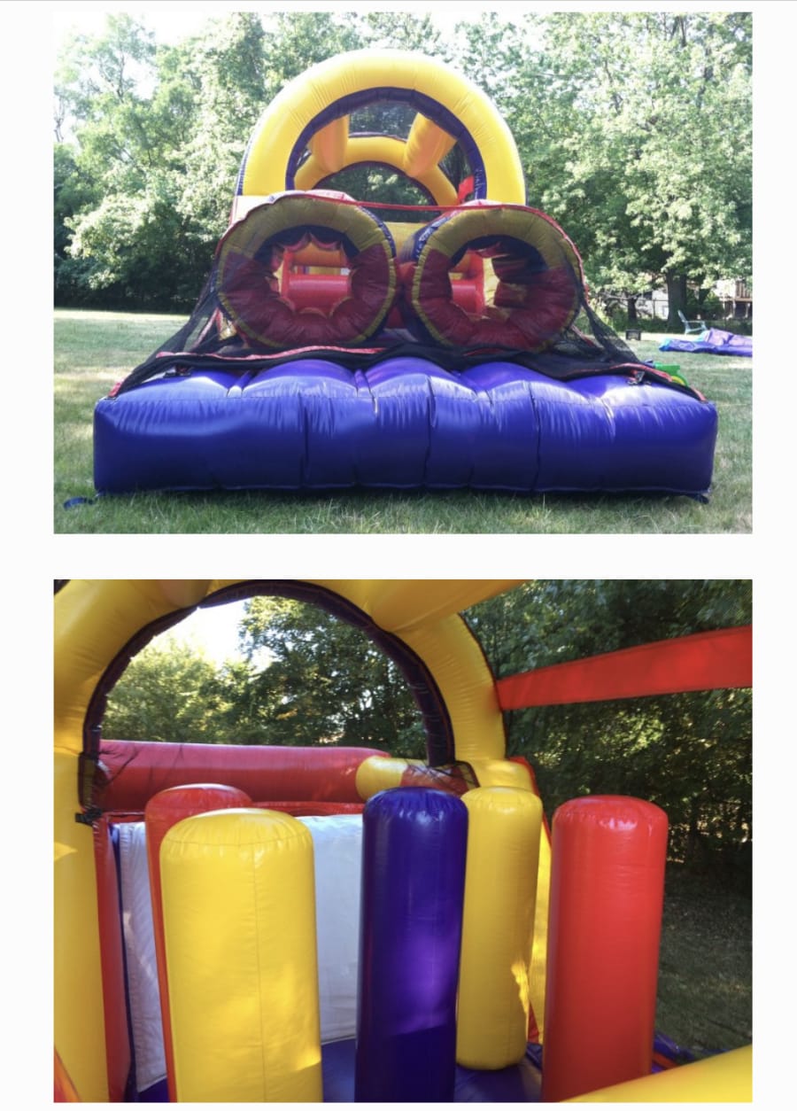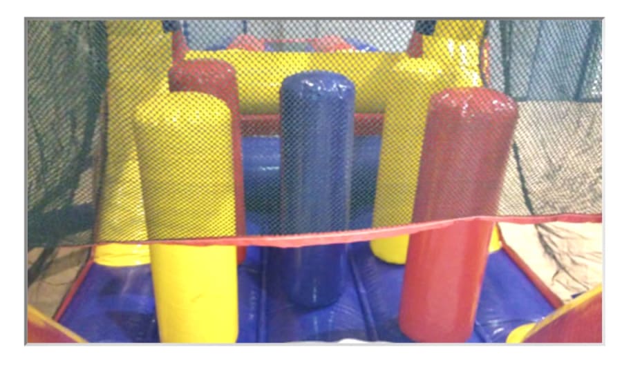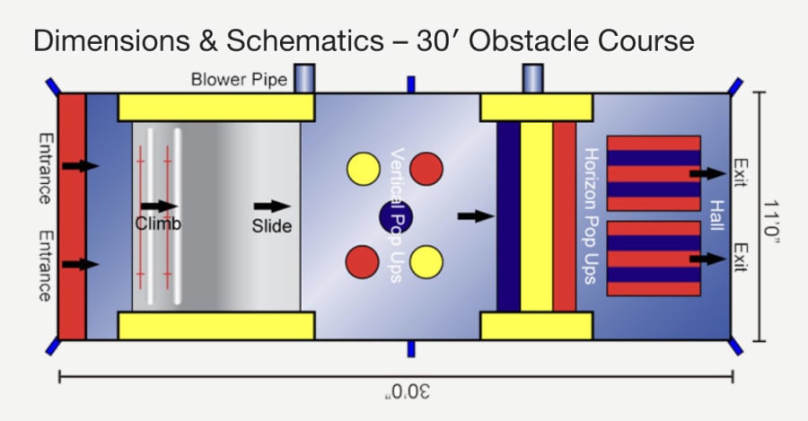 Ninja Jump's Backyard Obstacle Challenge offers 30 feet of challenge obstacle entertainment in one unit. This inflatable play structure takes participants on a journey crawling through tunnels, maneuvering around horizontal and vertical pop-ups, with stamina-building climbing and descending along the way! This sleek, low-profile Backyard Obstacle Challenge provides a bright, primary-colored purple, yellow and red theme and its arching design will attract attendees and keep them entertained. This inflatable obstacle course can be an amazing centerpiece for any backyard party. The inflatable play structure begins with a front-loading obstacle entrance, taking participants through tunnels and pop-ups to facilitate maneuvering skills and build confidence. The challenge obstacle then leads to an exciting front-exiting climb and slide, all to guarantee hours of enjoyable physical activity. Each inflatable play structure has mesh windows for easy viewing,