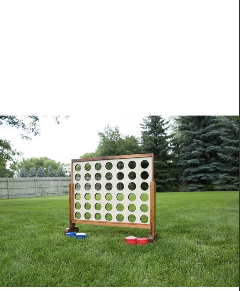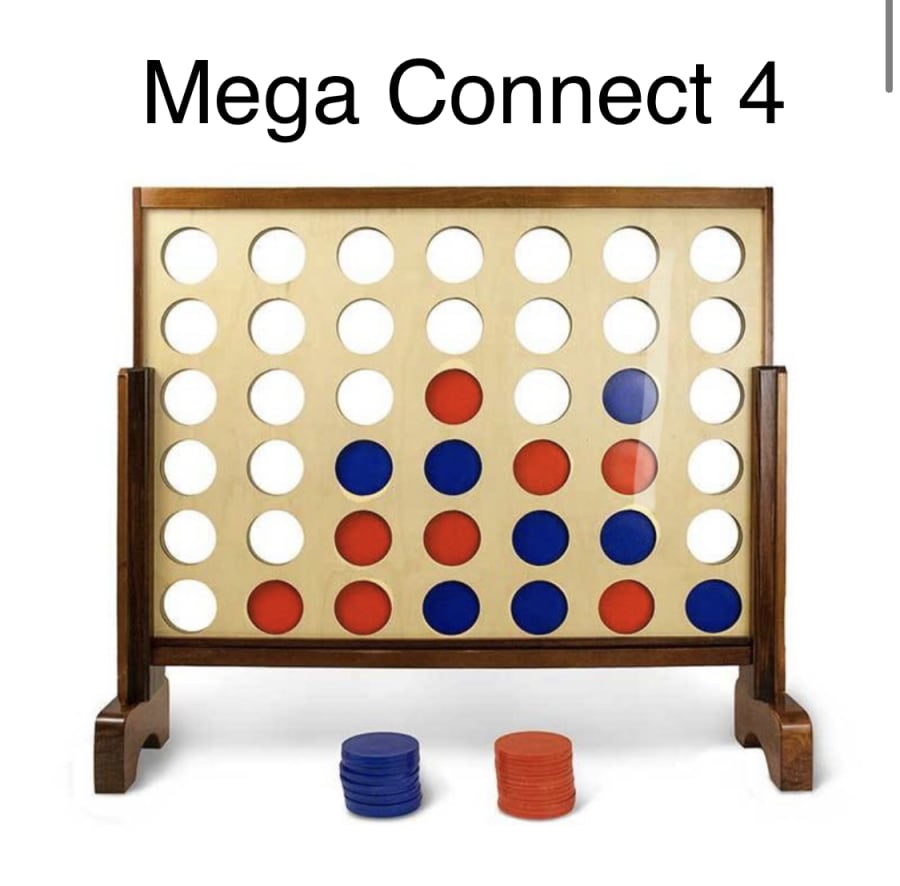 Mega Connect 4 -Get ready for some MEGA FUN with the new Mega Connect 4 Game! Perfect for all ages. This waist-high Connect 4 game is a great party starter! Use the giant pieces to get 4 in a row. When the game is over, just slide the bottom wood piece out to get the pieces.